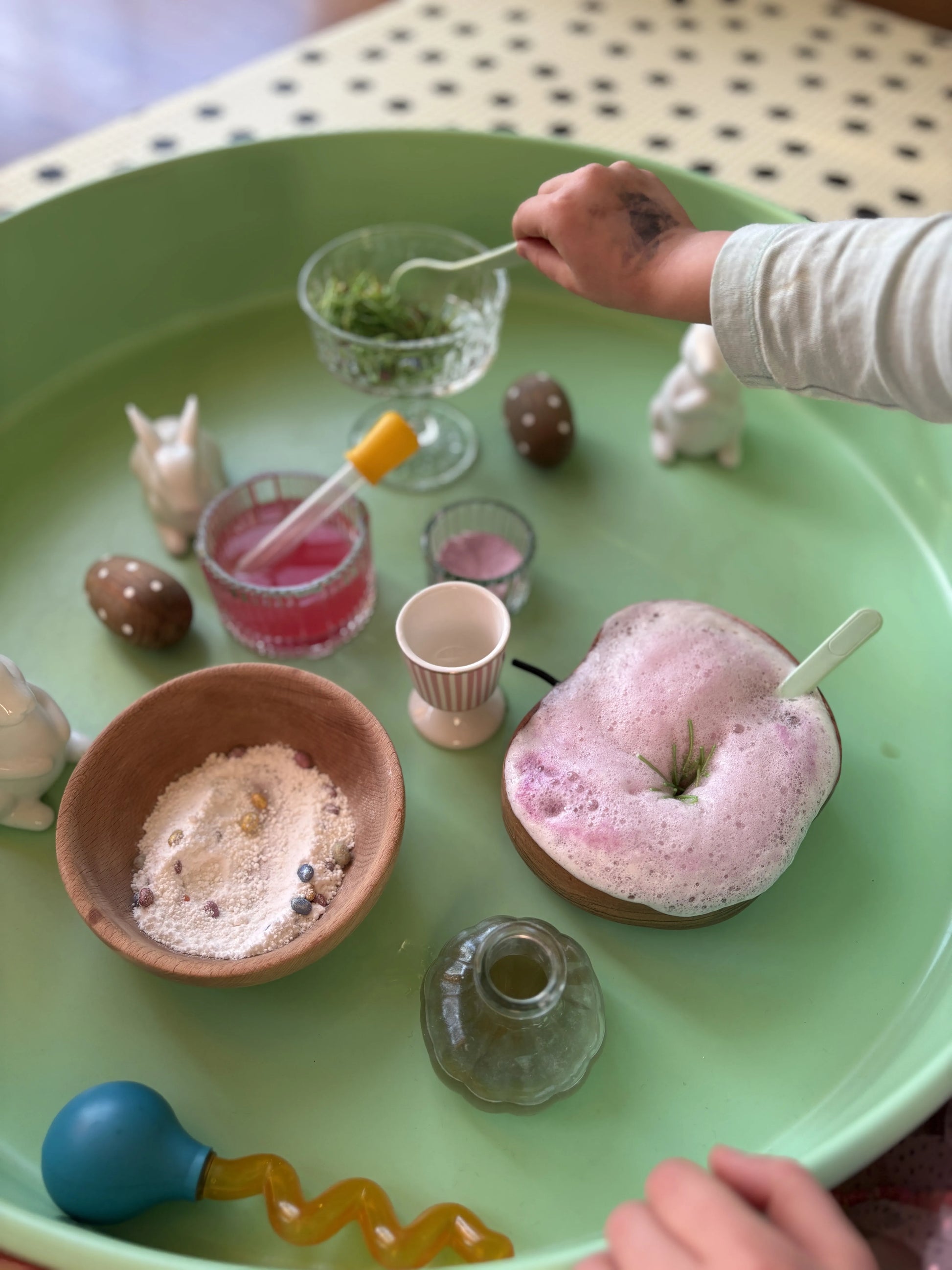Veľkonočné FarbiTo vyzerá ako malá jarná lúka - zelená zmes s farebnými pastelovými vajíčkami. Keď ho nasypeš do vody, voda sa ofarbí a zatrbliece. Ožije ti pred očami a zatancuje. A vznikne kúzelný elixír, ktorým môžeš zaliať svoje prášky. 🌿🥚